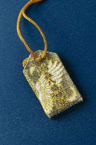 八幡神は武運の神でもあり、同社では棋力向上を祈願する勝守りを授与しています。なかでも金色に輝く「黄金の王手守」は、勝利を決定づける「詰み」の形を表す左右対称の美しい局面がデザインされたもの。この局面を実現するためには、桂馬が2段跳ねる「天使の跳躍」と呼ばれる動きを経なければならず、反対の面には羽ばたく白い翼がデザインされています。